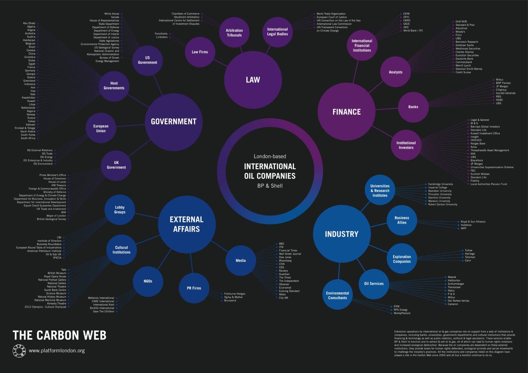 For more than a decade, Platform has been mapping out the network of relationships between oil and gas companies and the government departments, regulators, cultural institutions, banks and other institutions that surround them. We call this the Carbon Web.